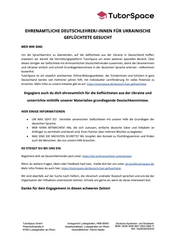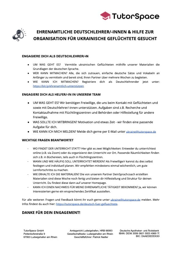 28. März 2022 Ehrenamtliche Deutschlehrer/-innen für ukrainische Geflüchtete gesucht tagPlaceholderTags: