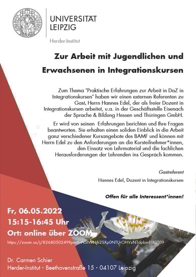 06. Mai 2022 Vortrag zum Thema "Praktische Erfahrungen zur Arbeit in DaZ in Integrationskursen" Zoom-Link zur Veranstaltung: https://zoom.us/j/8268050249?pwd=NStWNjh2SXp0NTUrOHVzNTdpbmFUQT09 tagPlaceholderTags:
