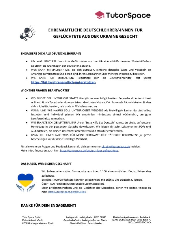 Ehrenamtliche Lehrkräfte für ukrainische Geflüchtete gesucht