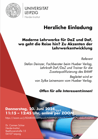 Lehrwerke entstehen nicht im luftleeren Raum, sondern sind Kinder ihrer Zeit. In diesem Seminar begleiten Sie den Hueber Verlag auf eine kurze (!) Zeitreise. Im Fokus steht natürlich die Frage, wie sich Lehrmaterialien für DaF/DaZ über die Jahre entwickelt haben und welche Impulse dafür wegweisend waren. Und was ist heute neu und wohin geht die Reise? Welche Akzente setzt man aktuell in der Lehrwerkentwicklung und warum? Es geht dabei um analoge wie um digitale Lehrwerke und -materialien gleichermaßen, die z.B. hier in Sachsen in den DaZ Vorbereitungsklassen an den Schulen und in den Integrations- bzw. Sprachkursen für Erwachsene Anwendung finden könnten oder auch in DaF-Kursen. Sie können sich gerne vorab ein paar Gedanken zu folgender Frage notieren: Welche Auswirkungen haben Ihrer Meinung nach das BAMF, Lehrpläne, der GER, der Arbeitsmarkt, unsere Vorstellungen von Heterogenität, Binnendifferenzierung, Lernerautonomie, Diversität und dergleichen mehr auf die Entwicklung von Lehrmaterial?