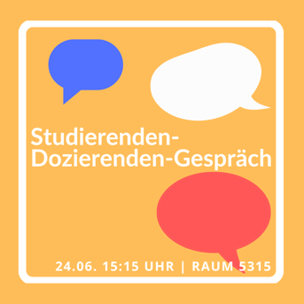 Habt ihr Probleme, Ideen oder einfach Gesprächsbedarf bei Themen rund um das Studium am Institut? Dann seid ihr bei diesem Gesprächsformat genau richtig! Hier können wir gemeinsam mit den Dozierenden über eure Anliegen reden und nach Lösungen suchen.