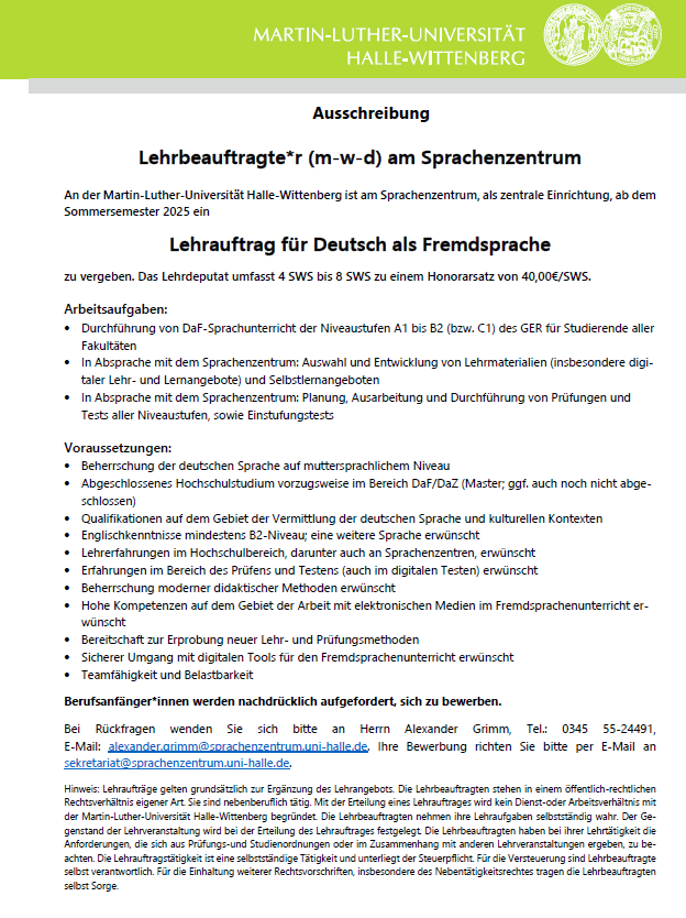 Deutschland · 21. Januar 2025 Lehrauftrag DaF am Sprachzentrum der Martin-Luther-Universität Halle-Wittenberg (ab Sommersemester 2025) tagPlaceholderTags: